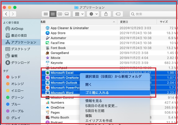 まず、「アプリケーション」フォルダを開き、Microsoft Officeを探します。次に、Officeを選択し、「移動」メニューから「ゴミ箱に入れる」を選択します。ゴミ箱に入れた後、ゴミ箱を空にする必要があります。これで、Wordを含むOffice全体がアンインストールされます。